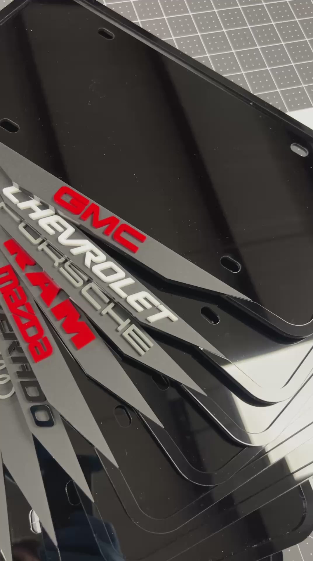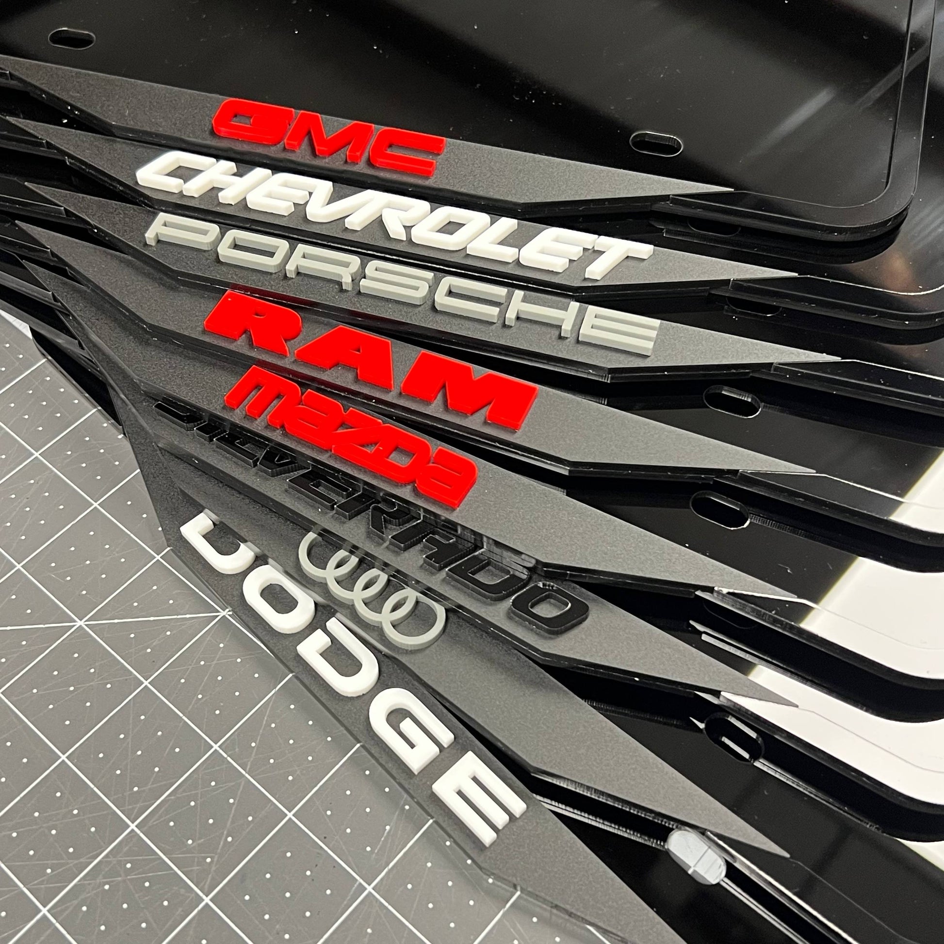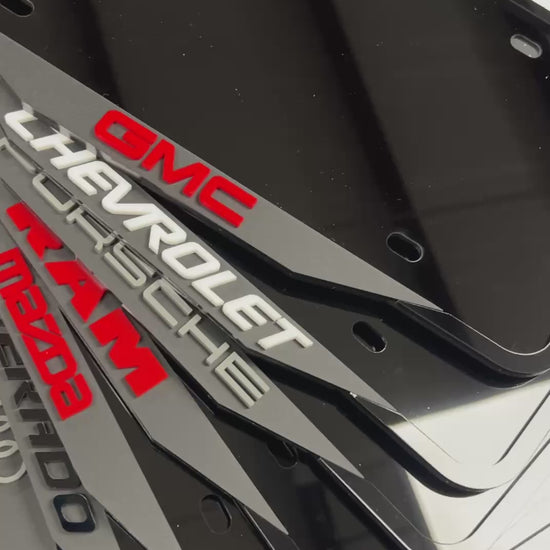 Any brand / model name: Chevrolet, RAM, Porsche, Silverado, Mazda, Audi rings, Dodge, etc. You can also request your own custom text.